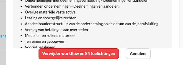 Wanneer het mogelijk om deze workflow te verwijderen klik je op de actieknop “verwijder workflow” en klik je op verwijder workflow en 84 toelichtingen. Dit kan even duren tot wanneer dit volledig verwijderd is.