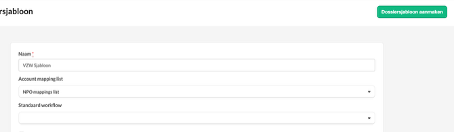 Voeg onderstaand dossiersjabloon toe en voeg indien gewenst, bij de standaard workflow, de VZW – jaarrekening toe. Dit zorgt ervoor indien je een nieuw VZW dossier opmaakt dat de workflow van de jaarrekening van VZW’s automatisch worden toegevoegd.