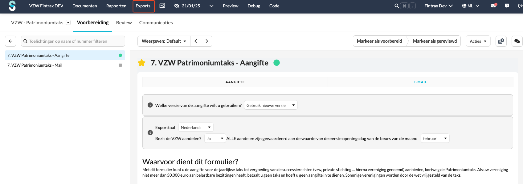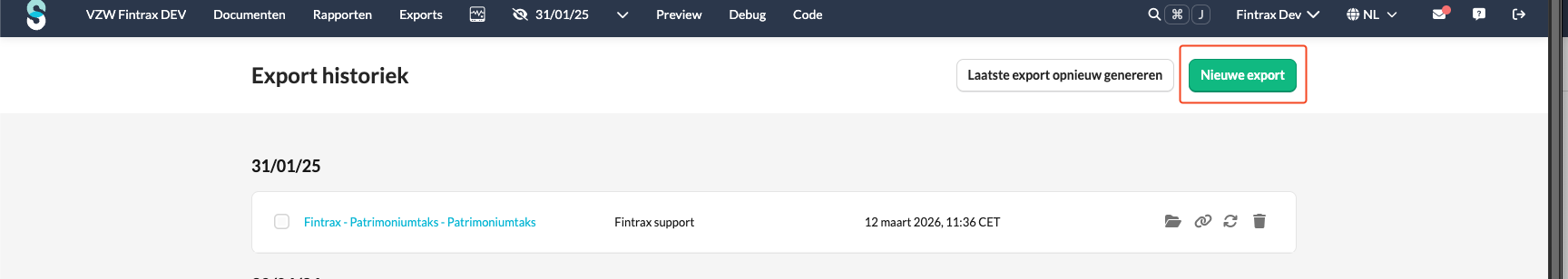 De export van de nieuwe aangifte van de patrimoniumtaks verloopt nu via de exports van Silverfin en niet meer via de actie knop. Je kan een export via Silverfin creëren door bovenaan op "Exports" te klikken.