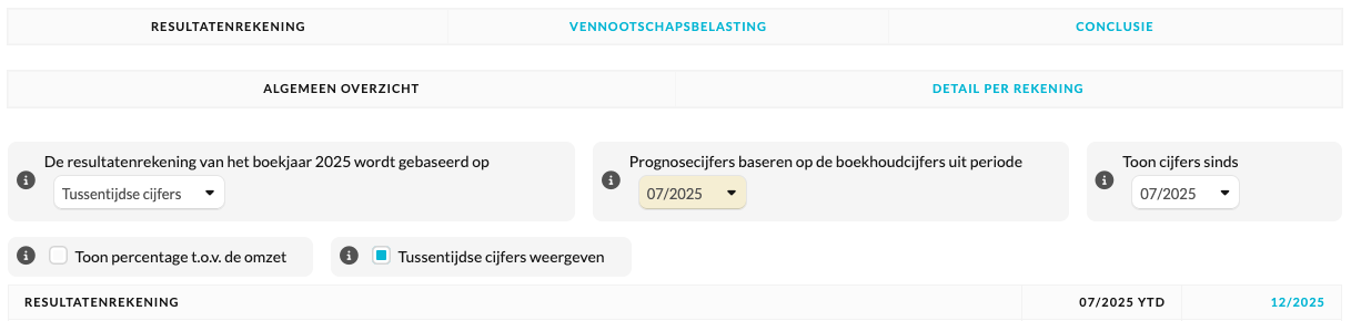 Met de eerste dropdown kies je op welke cijfers de resultatenrekening gebaseerd is: tussentijdse cijfers of de cijfers van vorig jaar.